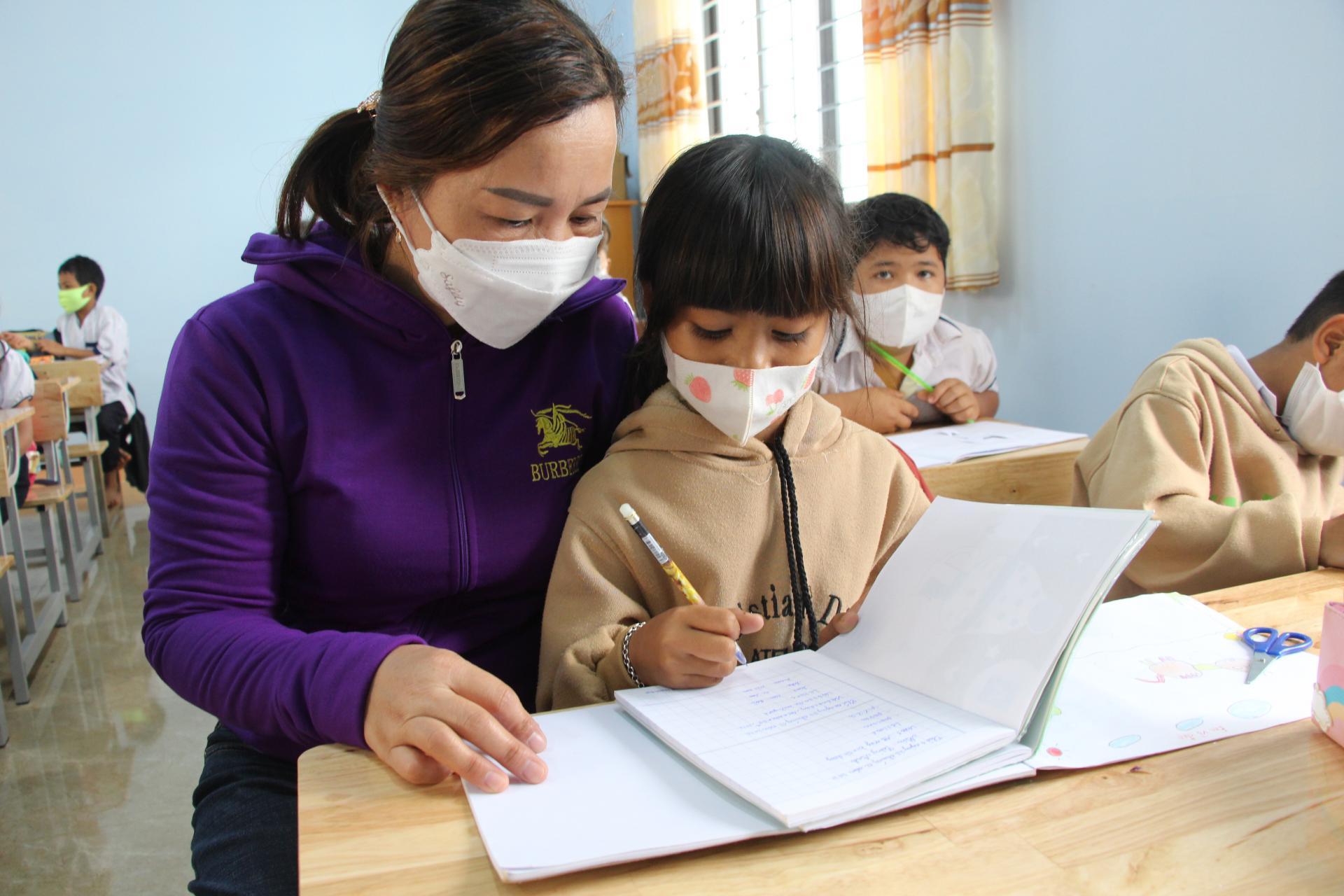 Cô Lưu Thị Hương, giáo viên chủ nhiệm lớp 2A, Trường Tiểu học Lê Văn Tám (thị trấn Ea Pốk) hướng dẫn em H’Wit Byã làm bài tập. |
