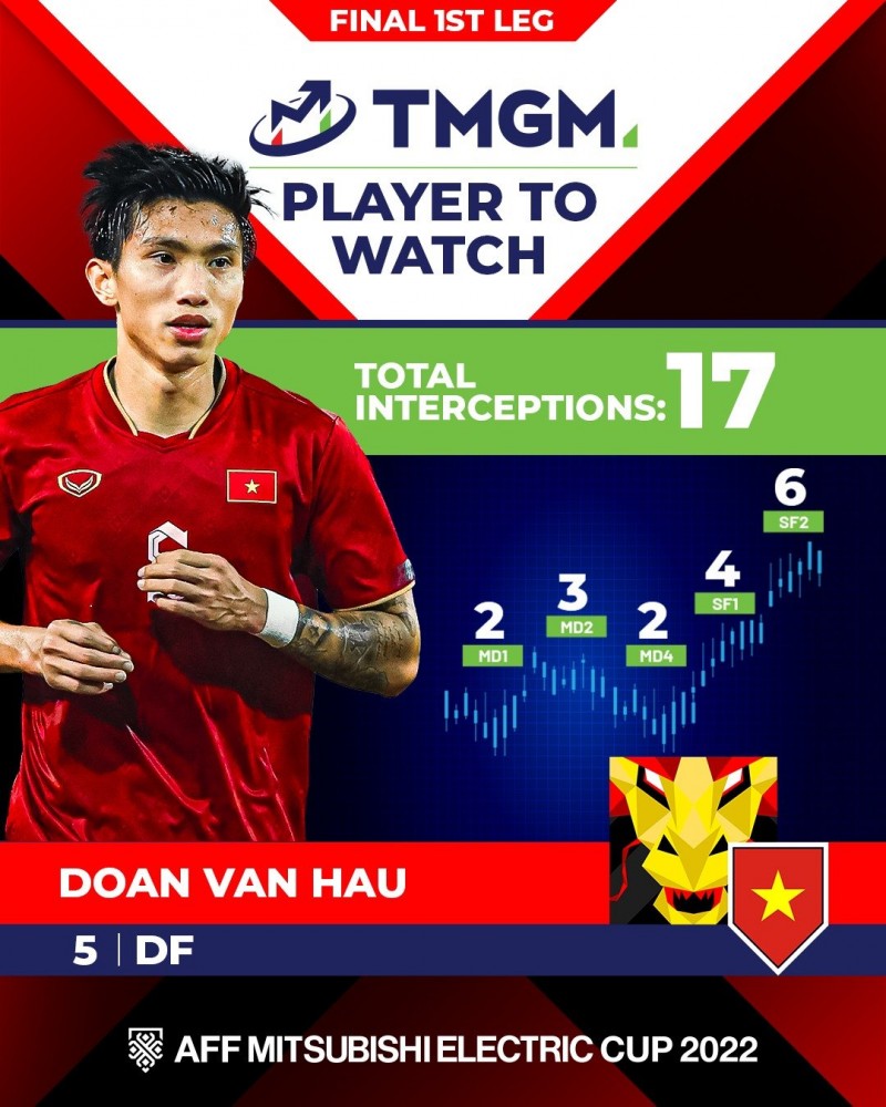 Với lối chơi dũng mãnh, không ngại va chạm, Văn Hậu thực sự đã tạo ra những ác mộng với các đối thủ, không chỉ là Malaysia mà còn cả với Indonesia. Theo thống kê từ ban tổ chức AFF Cup, Hậu đã có 17 pha đánh chặn thành công, 6 trong đó ở trận bán kết lượt về với Indonesia.