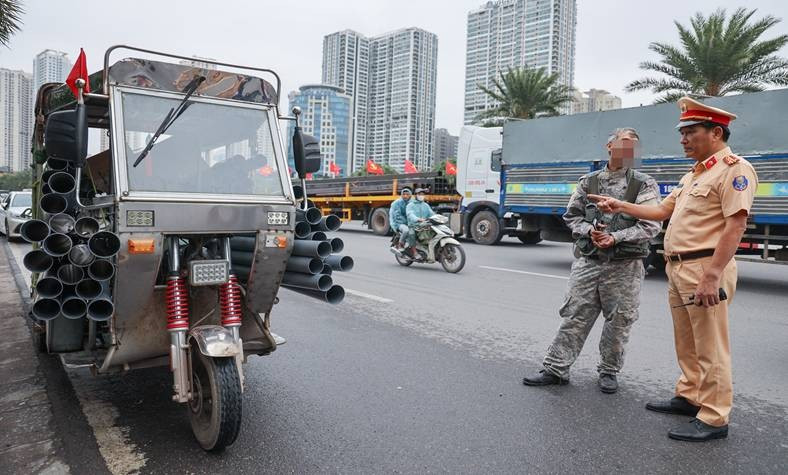 Qua kiểm tra, người điều khiển xuất trình giấy tờ tùy thân và thẻ thương binh hạng 3/4 mang tên N.V.Q. (SN 1959, trú tại xã Văn Giang, tỉnh Hưng Yên), song không xuất trình được giấy phép lái xe theo quy định. Phương tiện được xác định là xe ba bánh tự chế, chở nhiều ống sắt dài khoảng 6m, không có biển cảnh báo phía sau, tiềm ẩn nguy cơ cao gây tai nạn cho người và phương tiện khác tham gia giao thông.