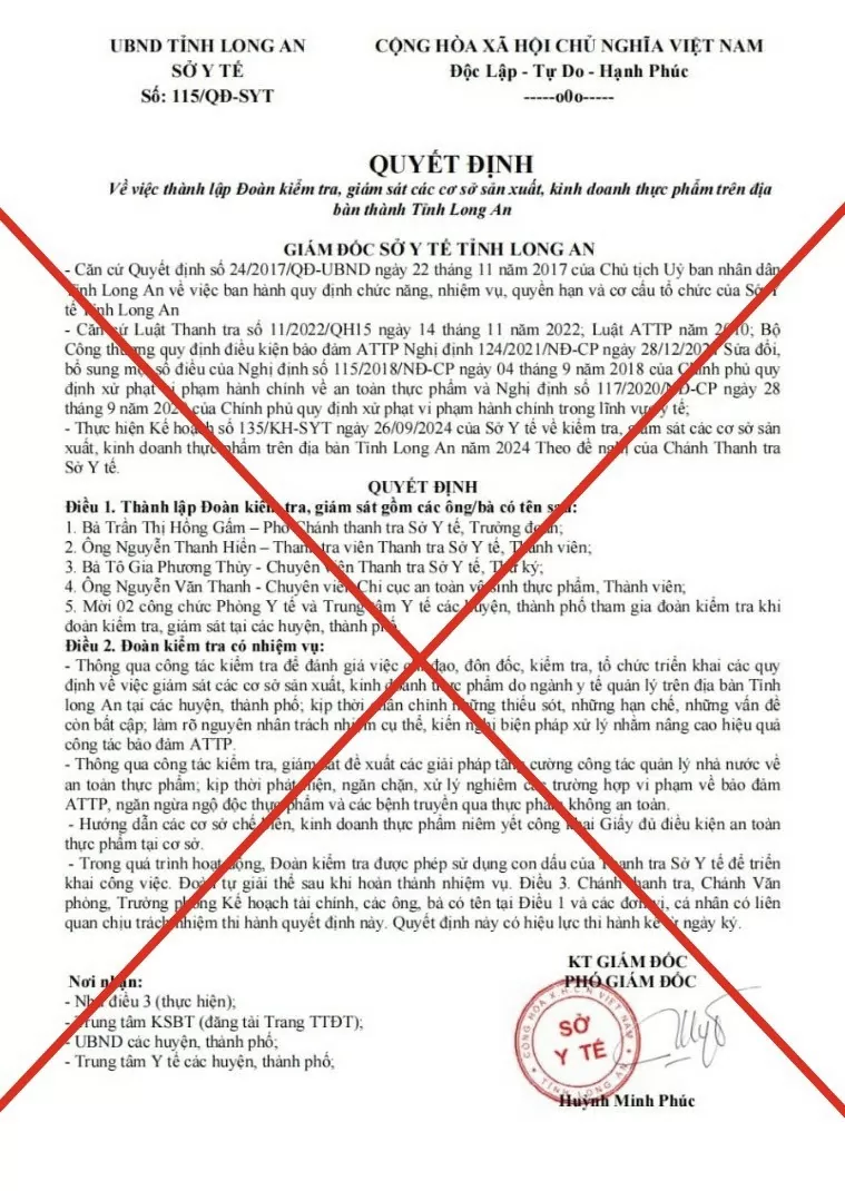 Trước đó, trên các mạng xã hội xuất hiện quyết định giả mạo Sở Y tế Long An. Quyết định giả mạo này ghi số 115 nhưng không có ngày, tháng, năm. Nội dung trong đó ghi “Thành lập đoàn kiểm tra, giám sát các cơ sở sản xuất, kinh doanh thực phẩm trên địa bàn tỉnh Long An”.