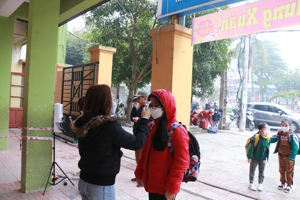 Đo thân nhiệt cho học sinh thành phố Vinh khi trở lại trường. Ảnh: Mỹ Hà