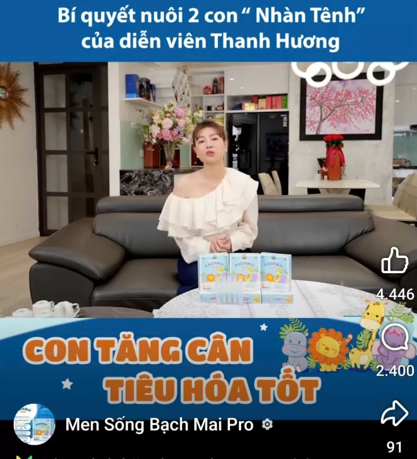 Ngay phần mở đầu clip quảng cáo trên mạng xã hội, Thanh Hương khẳng định: “Men sống Bạch Mai Pro là một sản phẩm thế hệ mới nhất và cải tiến nhất… chứa đến sáu tỉ bào tử lợi khuẩn, gấp hai lần men vi sinh thông thường, với hiệu quả vượt trội 5 trong 1…”.