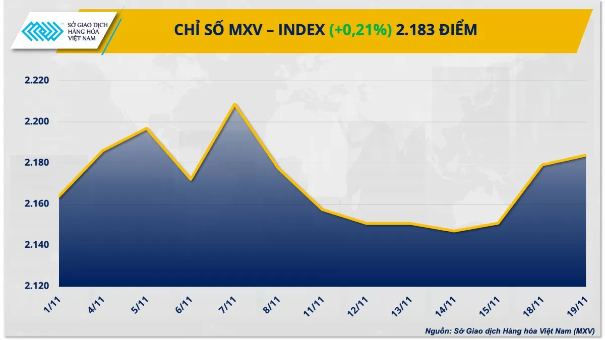 Theo Sở Giao dịch Hàng hóa Việt Nam (MXV), lực mua chiếm ưu thế trên thị trường hàng hóa nguyên liệu thế giới trong phiên giao dịch ngày 19/11.
